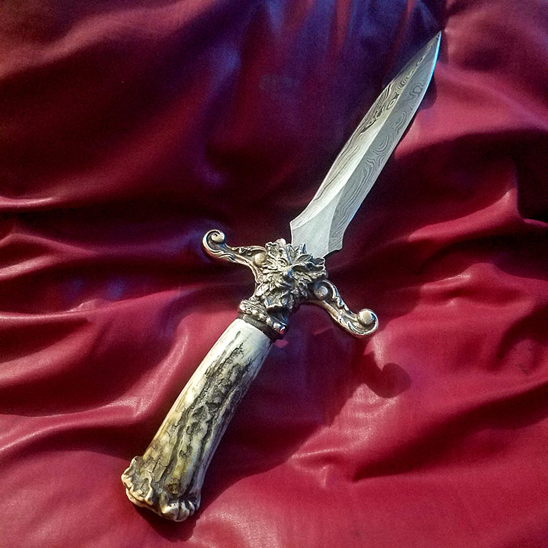 Greenman Athame Size: Overall length 12", Blade: 6.5" Weight: 1 lb Damascus steel Price: $250 without sheath, $275 with sheath Please email stonecraftarts@yahoo.com to order.